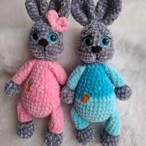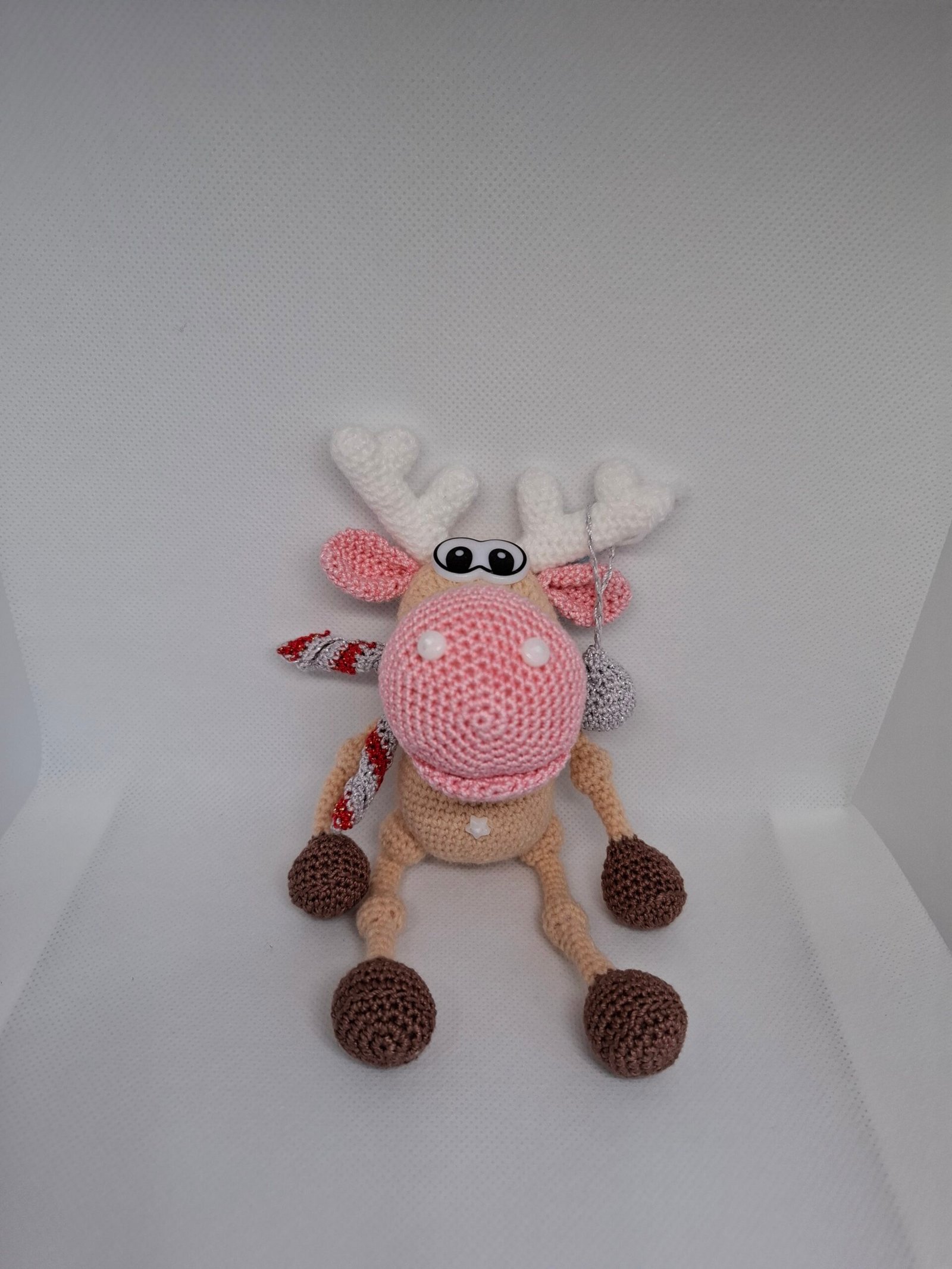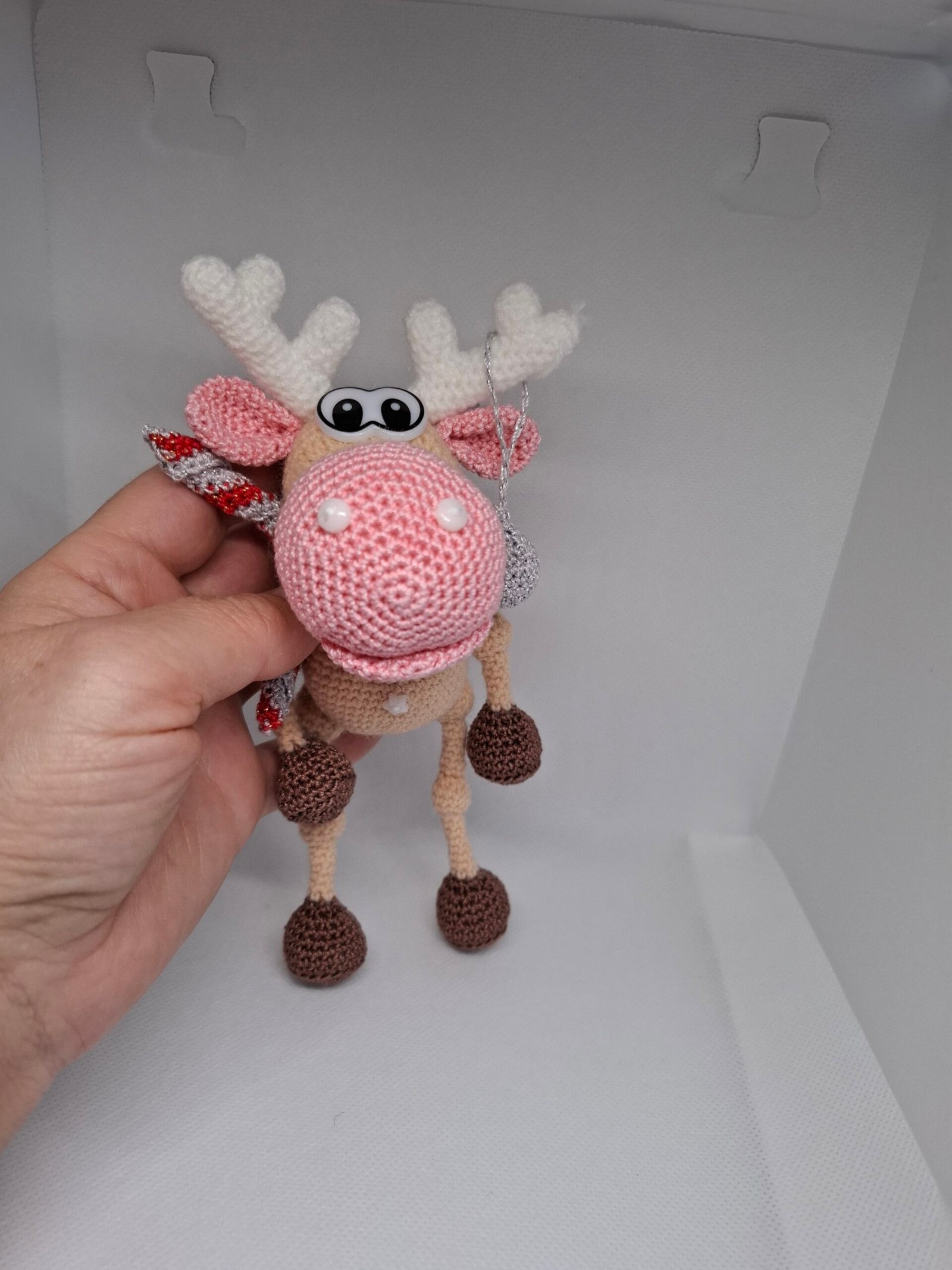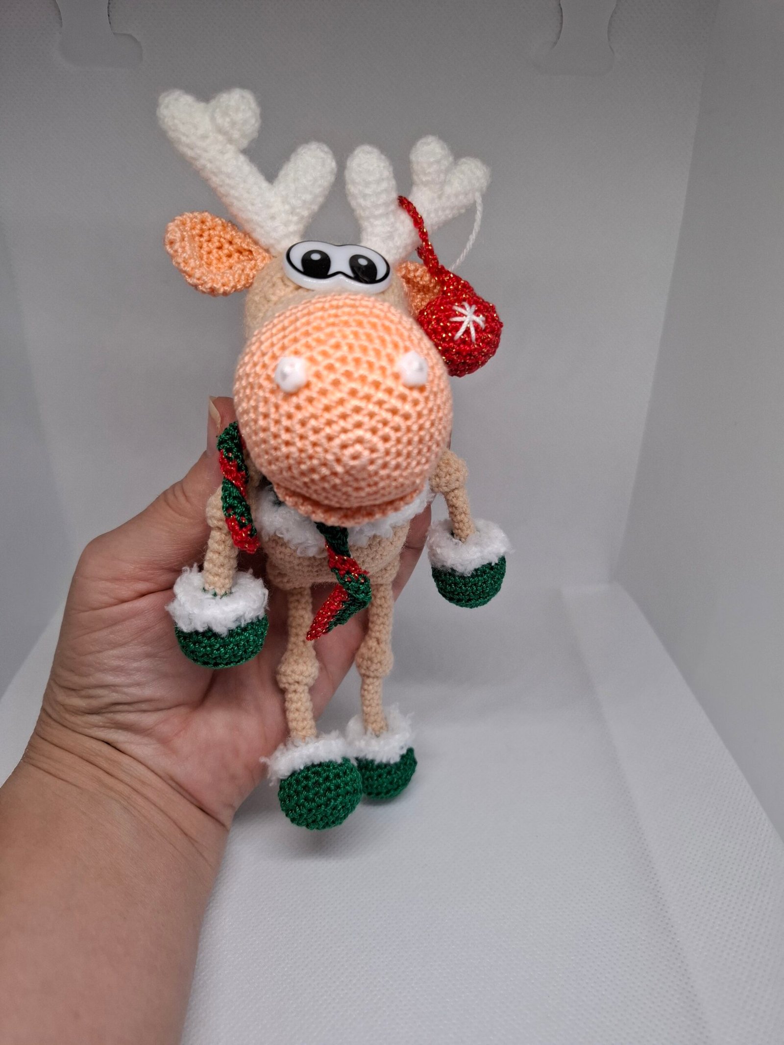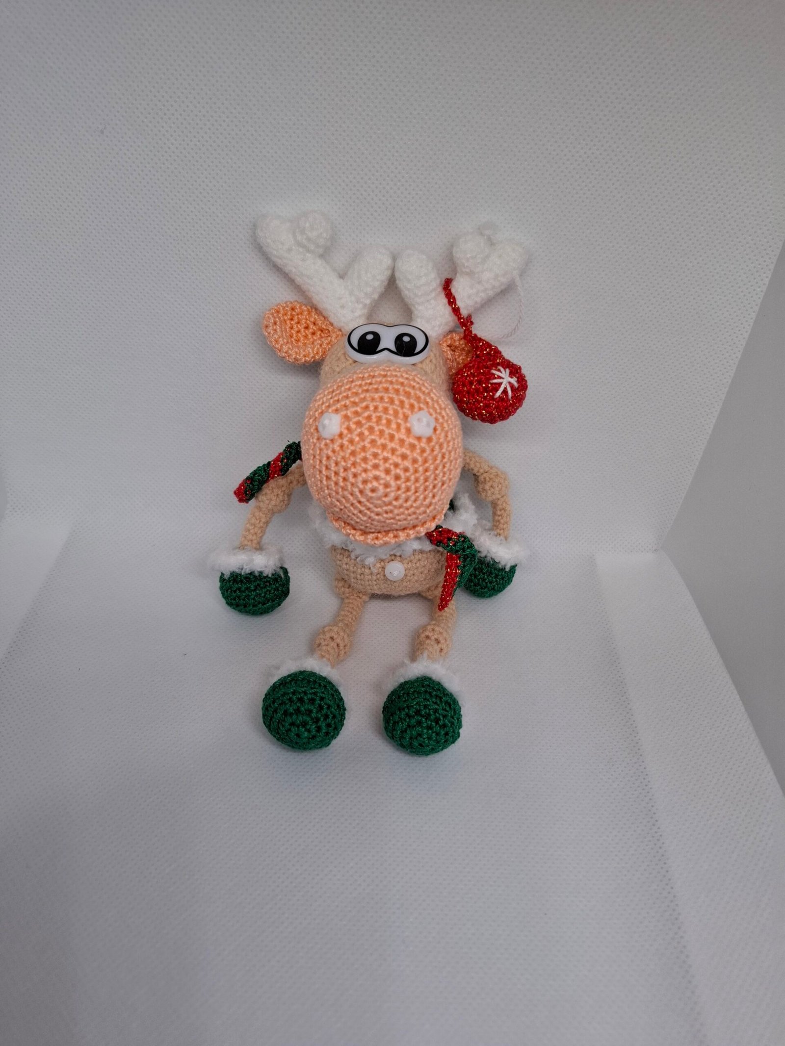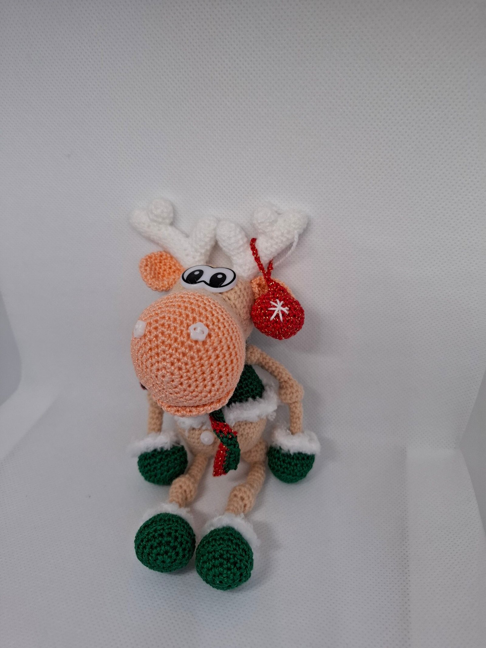 Cute handmade moose. Each of my toys is handmade, so they are not identical. Each one is unique. One is festively dressed, both have a toy hanging from their antlers. One moose is dressed only with a scarf and a toy, and the other also has a green jacket. They are small, so you can take them with you on a trip, to the kingdom of dreams. The eyes are securely fastened from the inside.