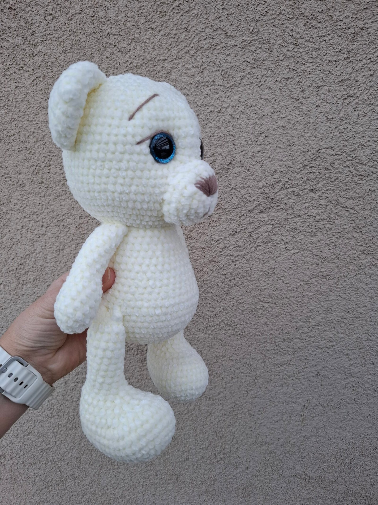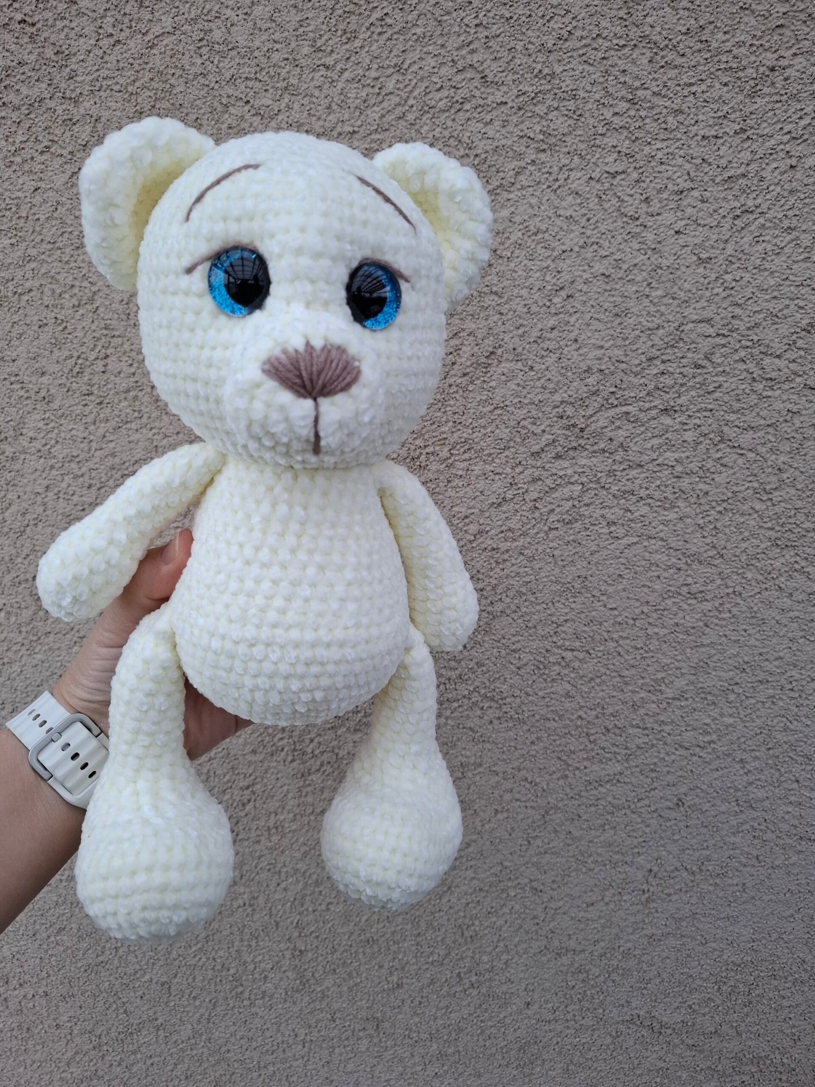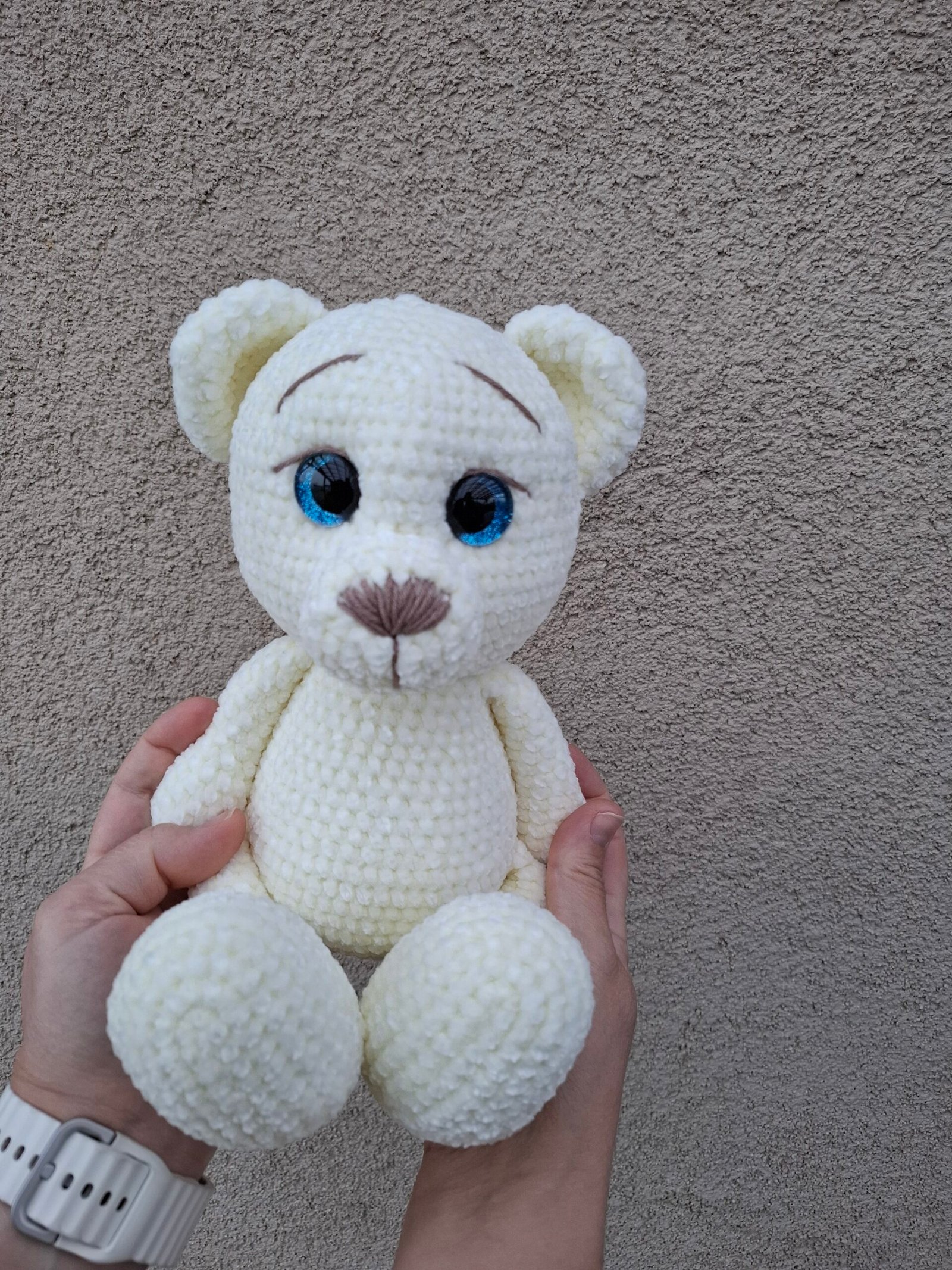 Šis mielas rankų darbo meškiukas – tikras švelnumo ir jaukumo įsikūnijimas. Nertas iš ypatingai minkštų, švelnių siūlų, jis puikiai tinka apkabinimams ir dovanoms. Didelės, žvilgančios akytės suteikia žaisliukui išraiškingumo. Akytės saugiai užsegtos iš vidaus.