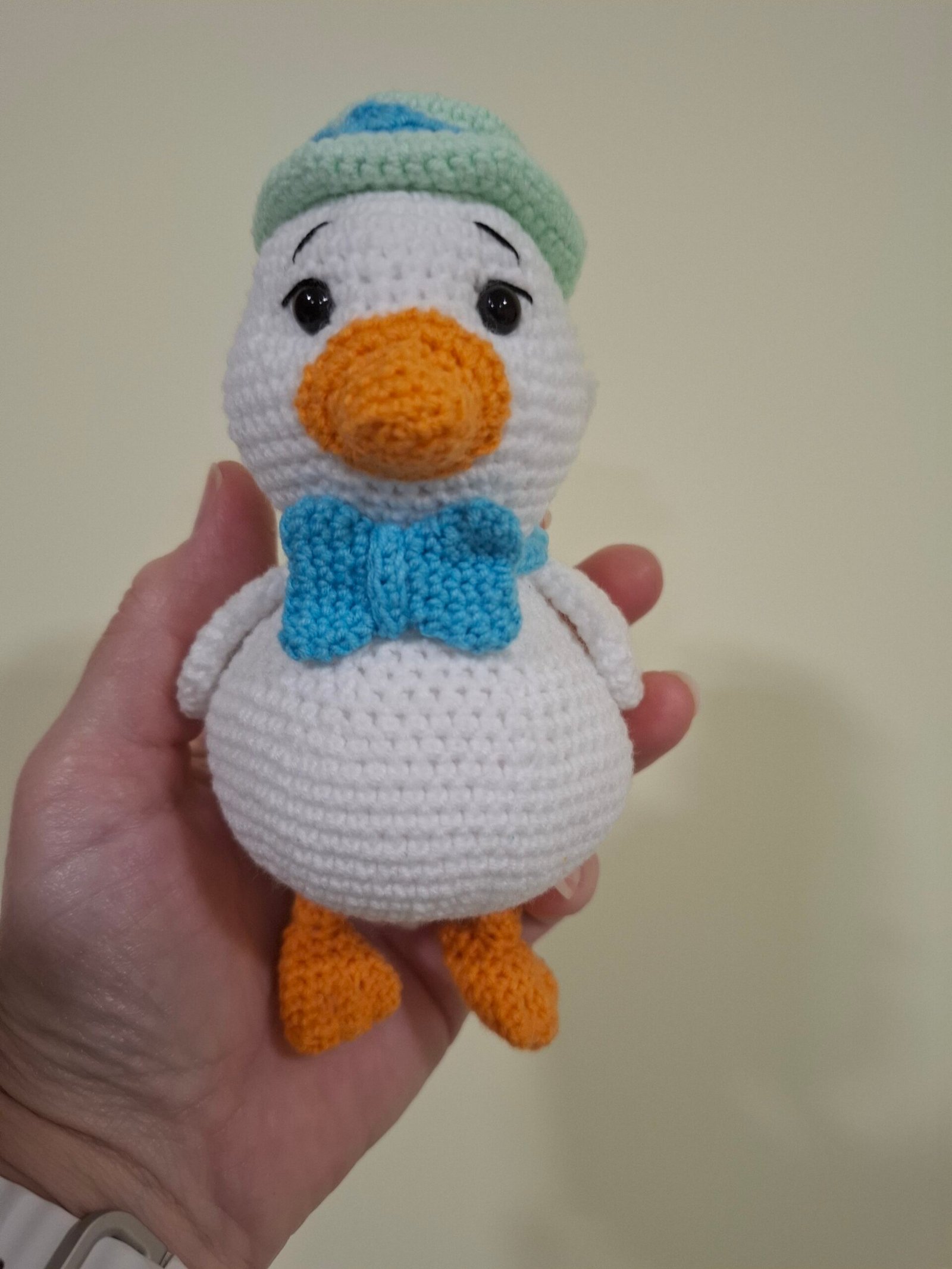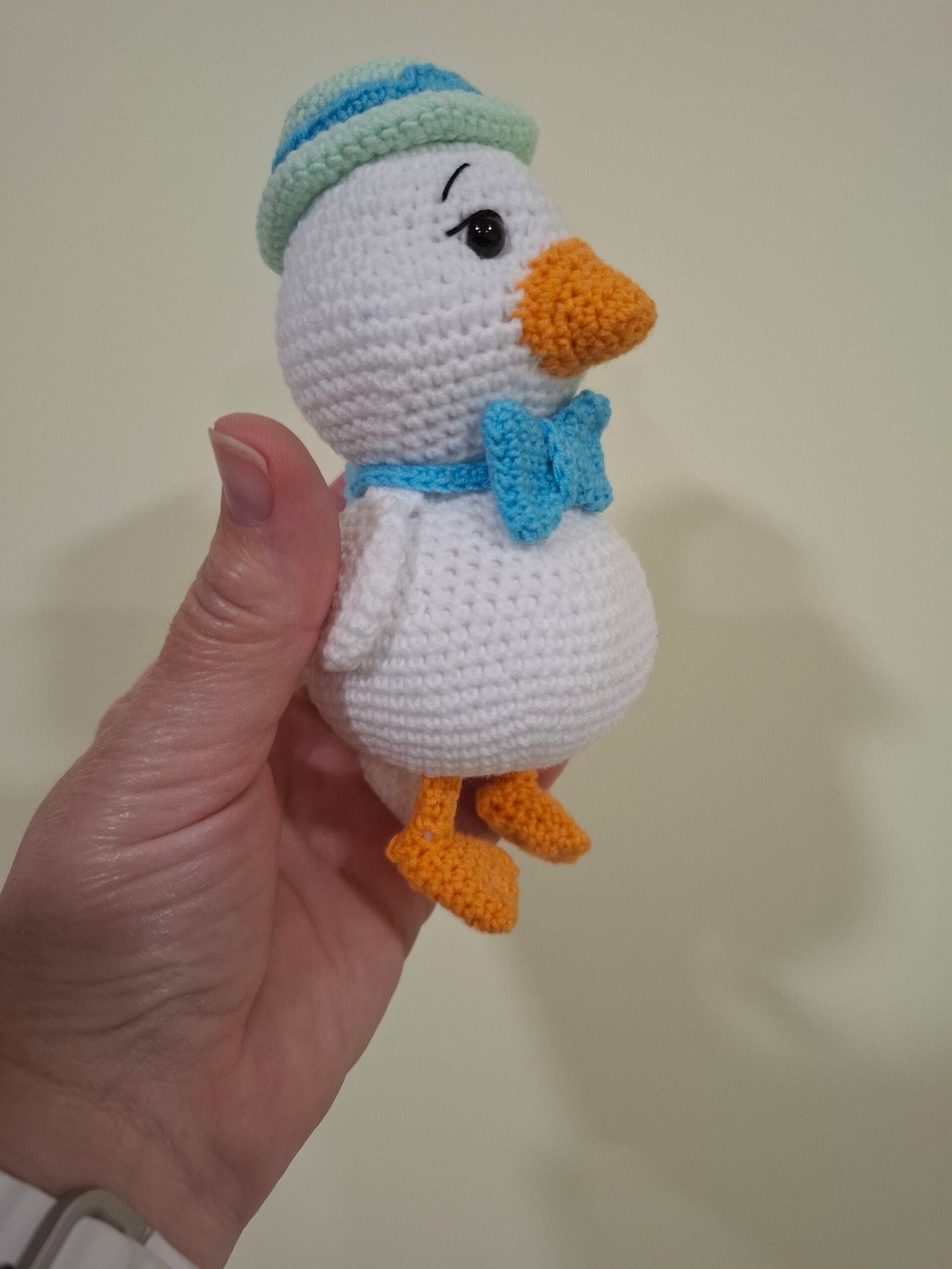 Mažas draugas su charakteriu. Šis žavingas, 12cm ūgio rankų darbo nertas ančiukas sukurtas su meile ir kruopštumu iki smulkiausios detalės. su stilinga kepuraite ir žaisminga peteliškė (kuri yra nusegama) jis atrodo lyg pasiruošęs dovanoti šypseną kiekvienam, kas jį sutiks.
