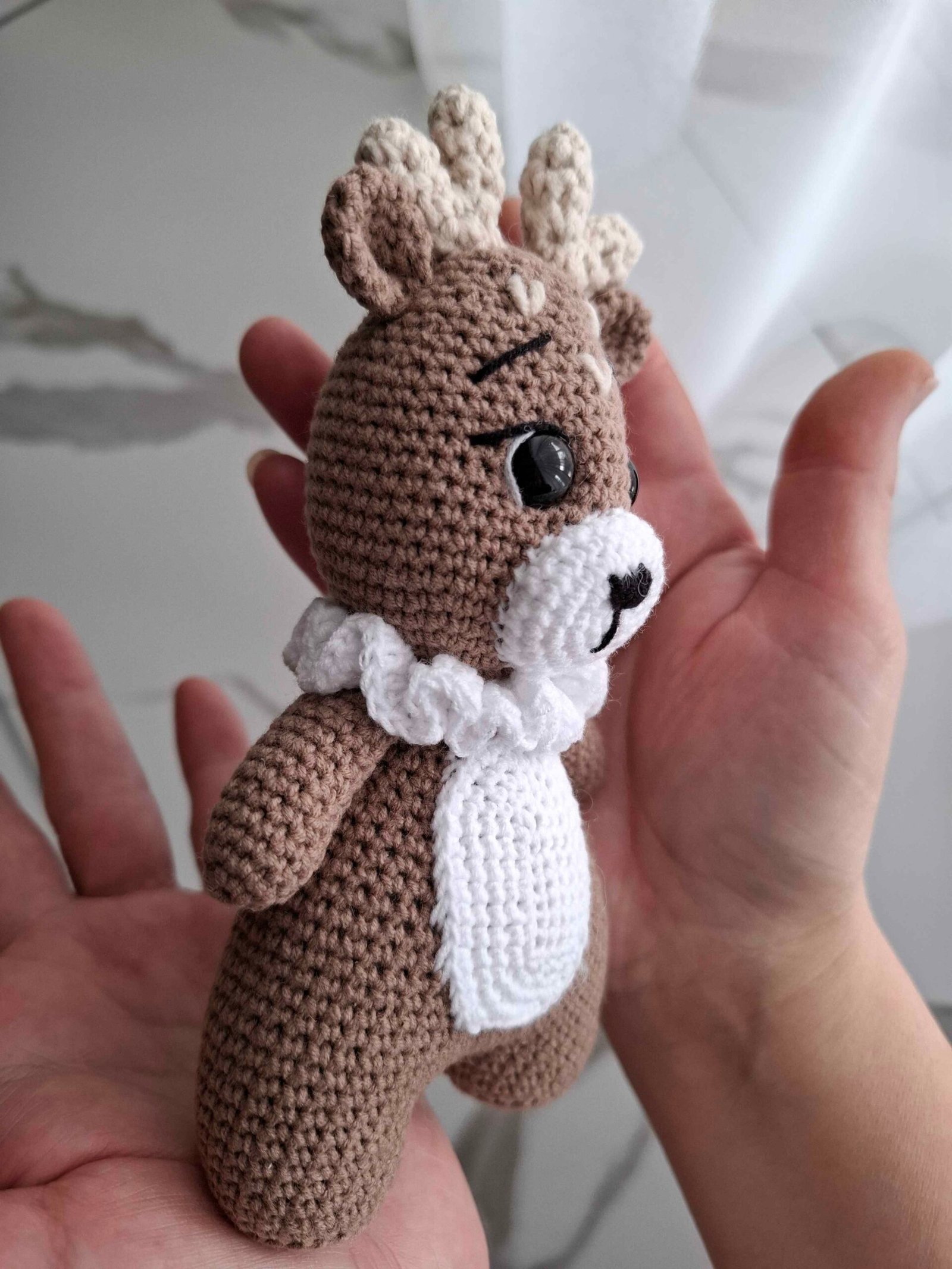 Šis elniukas rankų darbo nertas draugas – mažos širdelės džiaugsmas! Minkštas, jaukus ir su meile sukurtas rankomis – šis žaisliukas taps ypatingu draugu mažyliui arba miela dovana bet kokia proga. Jis nedidukas tik 16cm tad gali visur lydėti : kelionėse, į sapnų karalystę, į darželį.